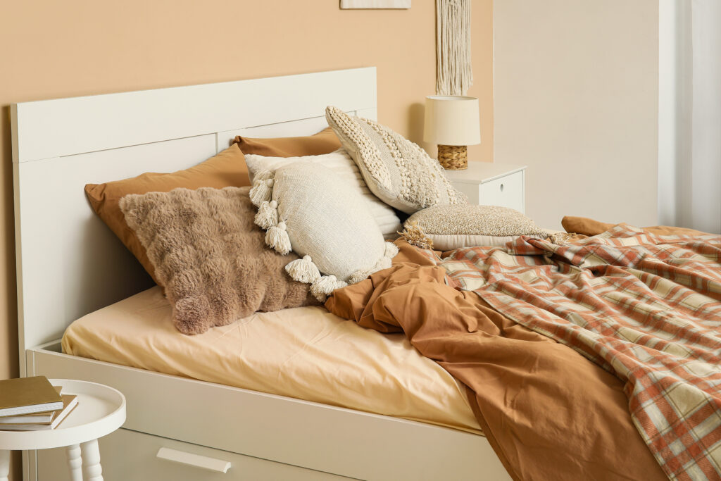 Im Schlafzimmer sorgt Karo für Ruhe und Wohlgefühl. Ein kariertes Bettüberwurf, Vorhänge oder eine Akzentwand hinter dem Kopfteil geben dem Raum Tiefe und Struktur, während dezente Herbstfarben wie Sand, Grau oder warme Rottöne Harmonie erzeugen.